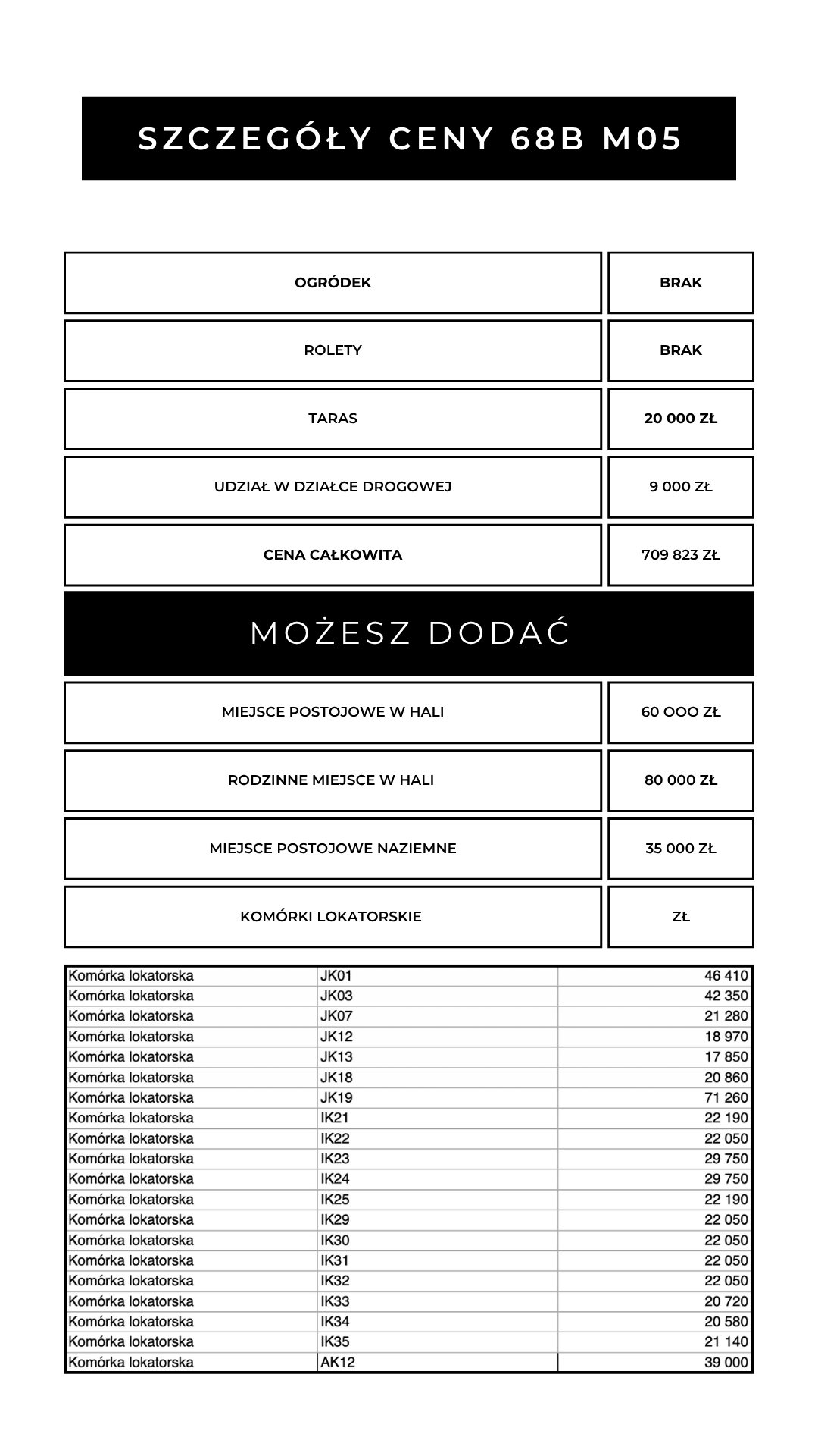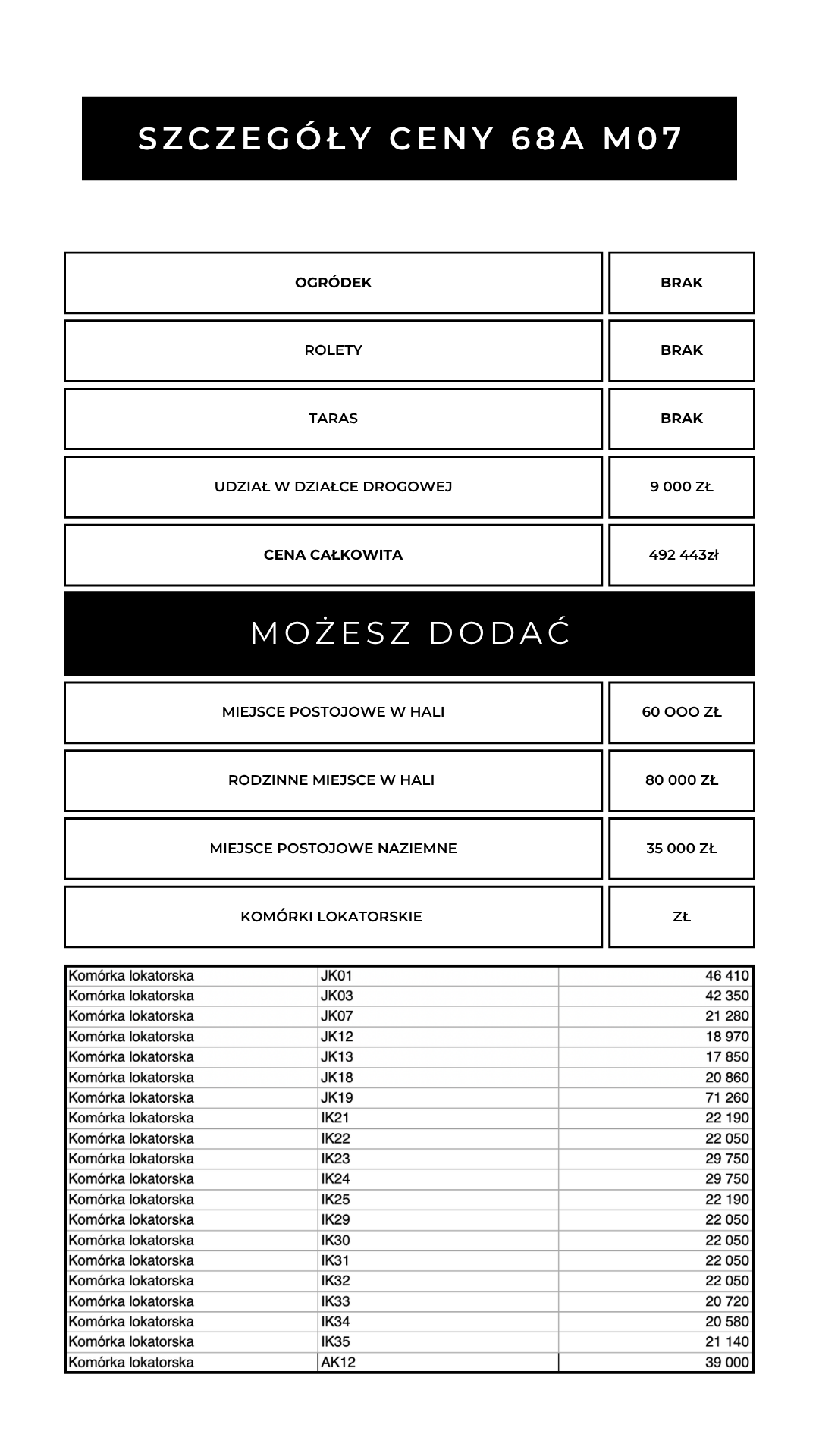 - Komórkę lokatorską – 7 000 zł / m2